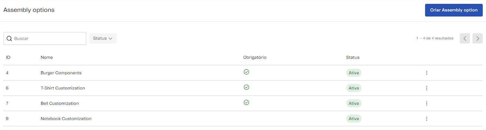Agora, com o aplicativo, é possível fazer essa configuração na nova página Produtos > Assembly Options no Admin VTEX, utilizando uma interface mais simples e específica para esse cenário.