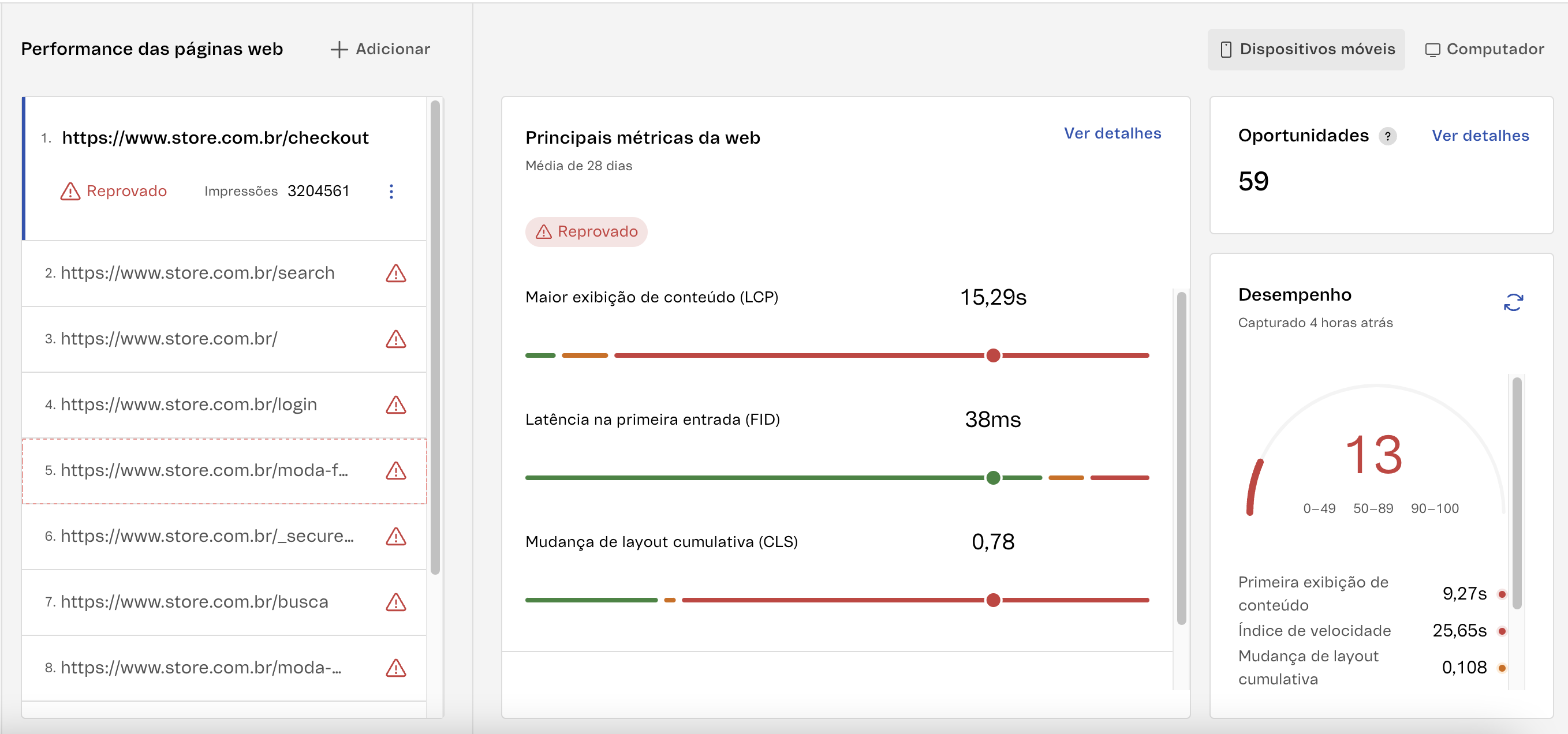 Rastrear e analisar o desempenho de uma loja digital é um exercício importante para se tornar ainda mais competitivo no mercado, já que uma boa experiência do usuário costuma gerar melhores resultados nos negócios e conversões de vendas. O dashboard “Performance das páginas web” ajuda os lojistas a monitorar a experiência de desempenho das principais páginas de seu ecommerce e, ao mesmo tempo, descobrir as razões por trás de um desempenho mais lento.