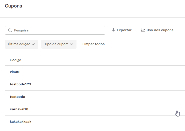 A nova Lista de cupons exibe todos os cupons cadastrados na sua loja, possibilitando gerenciar seus dados e analisar em quais pedidos foram utilizados.