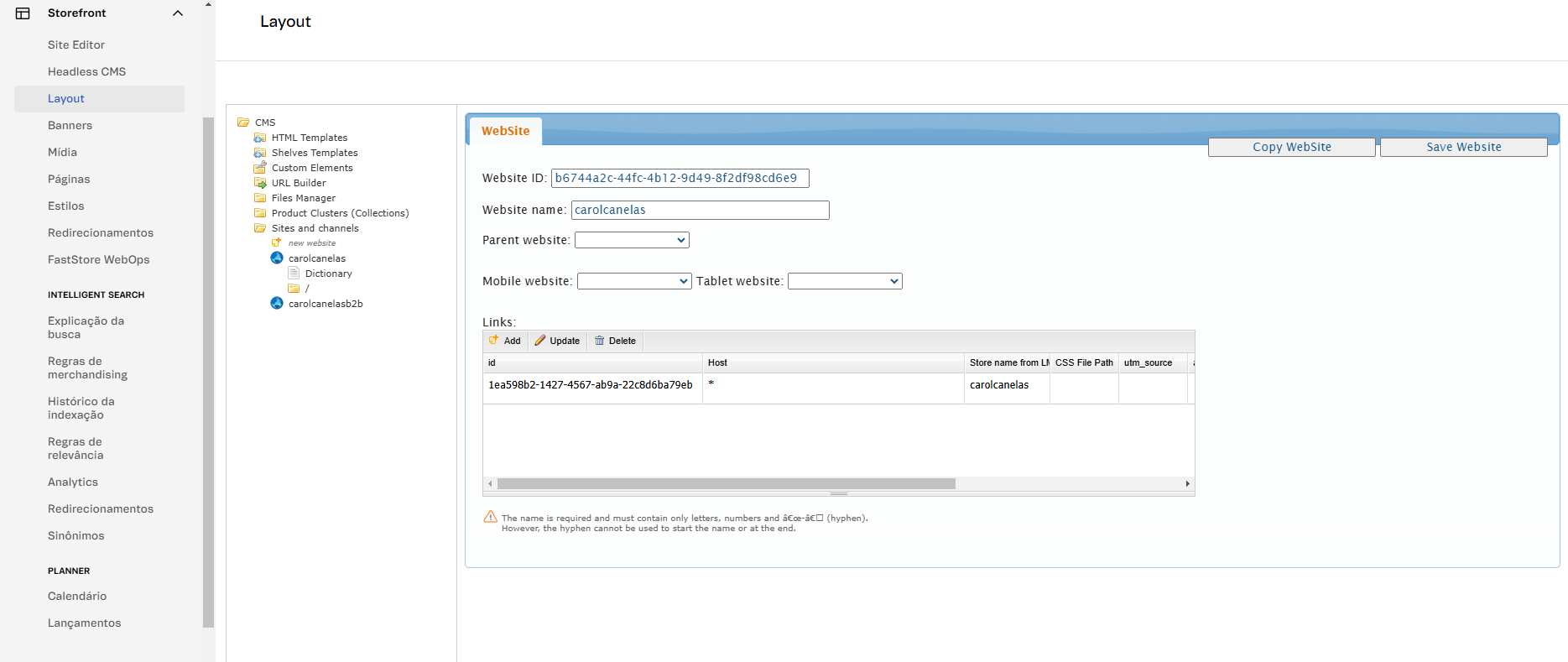 Lojas desenvolvidas com Store Framework também devem configurar o binding da loja, através da pasta Sites and channels na seção Layout do Admin VTEX.