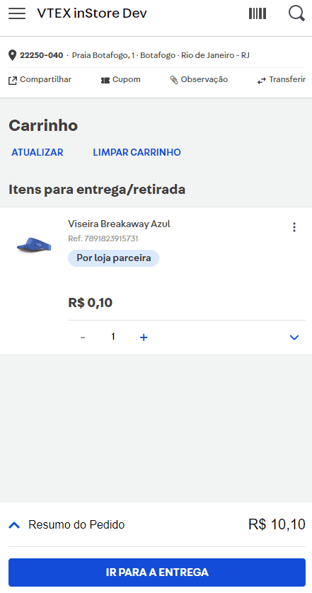 Se o código do vendedor estiver habilitado, será obrigatório preenchê-lo antes de compartilhar o carrinho. Para mais informações sobre o código do vendedor, acesse o guia Customizar o inStore e o guia para desenvolvedores Enable the Sales Rep Code.