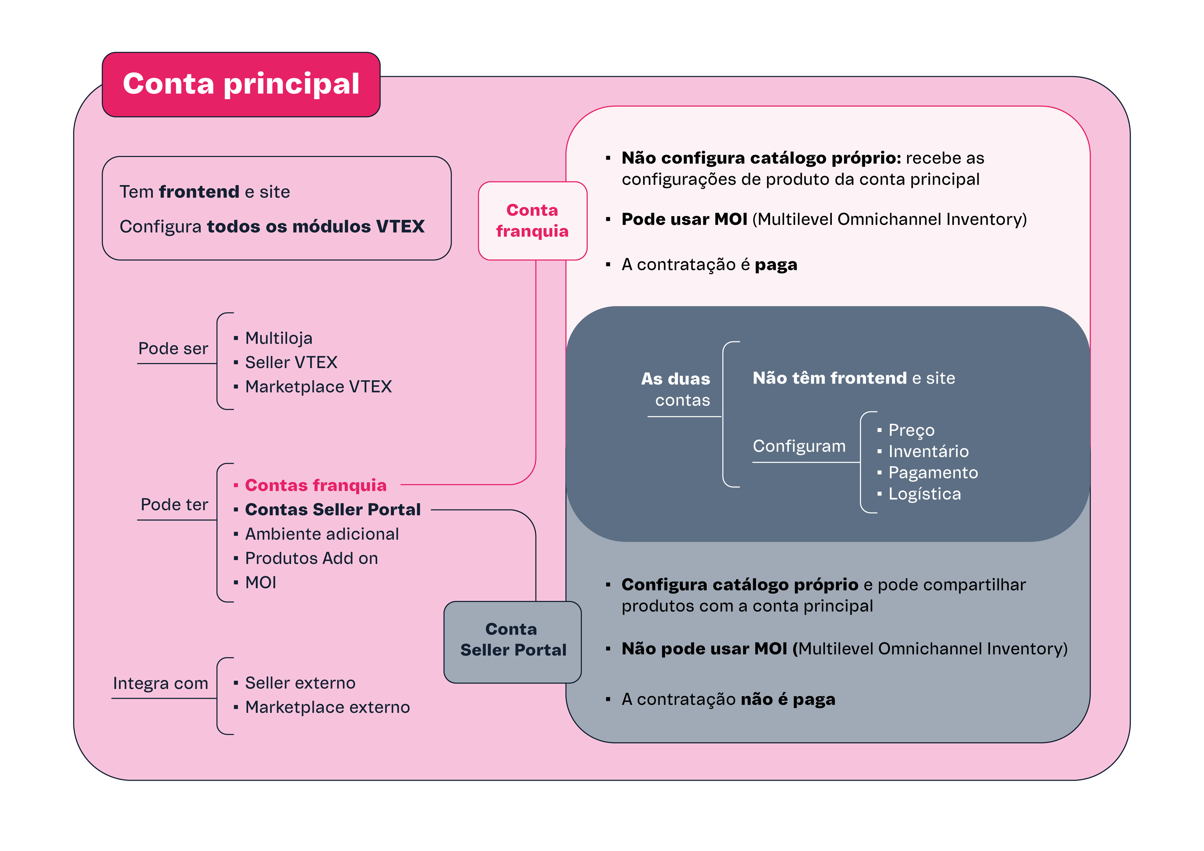 • Conta franquia: é uma conta vinculada à conta principal, não possui site próprio e sua característica mais marcante é não configurar catálogo próprio, e sim recebê-lo da conta principal. Esse tipo de conta é recomendada para operações com lojas físicas, franqueados e representantes da marca, mas a loja não precisa necessariamente ter uma rede de franqueados para se beneficiar dos recursos de uma conta franquia na VTEX.