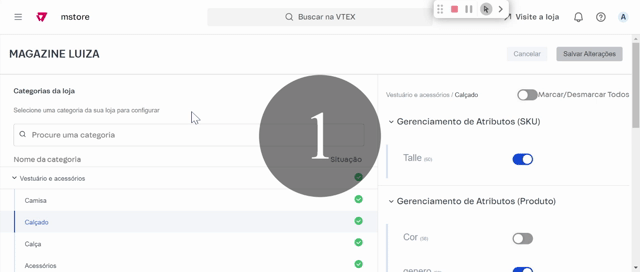 Em cada categoria listada, é possível habilitar ou desabilitar os atributos de produtos e SKUs que serão enviados ao Magazine Luiza.