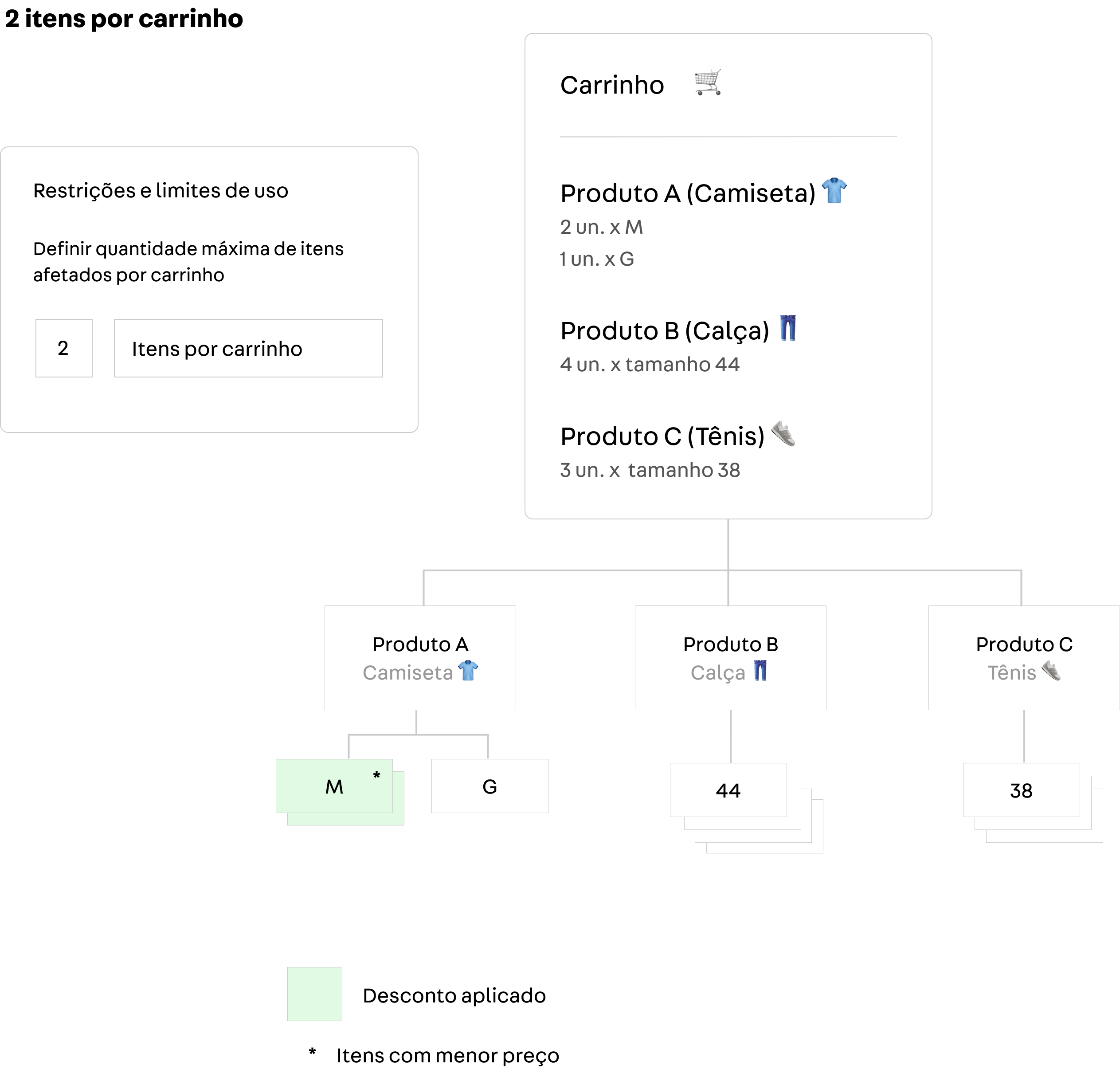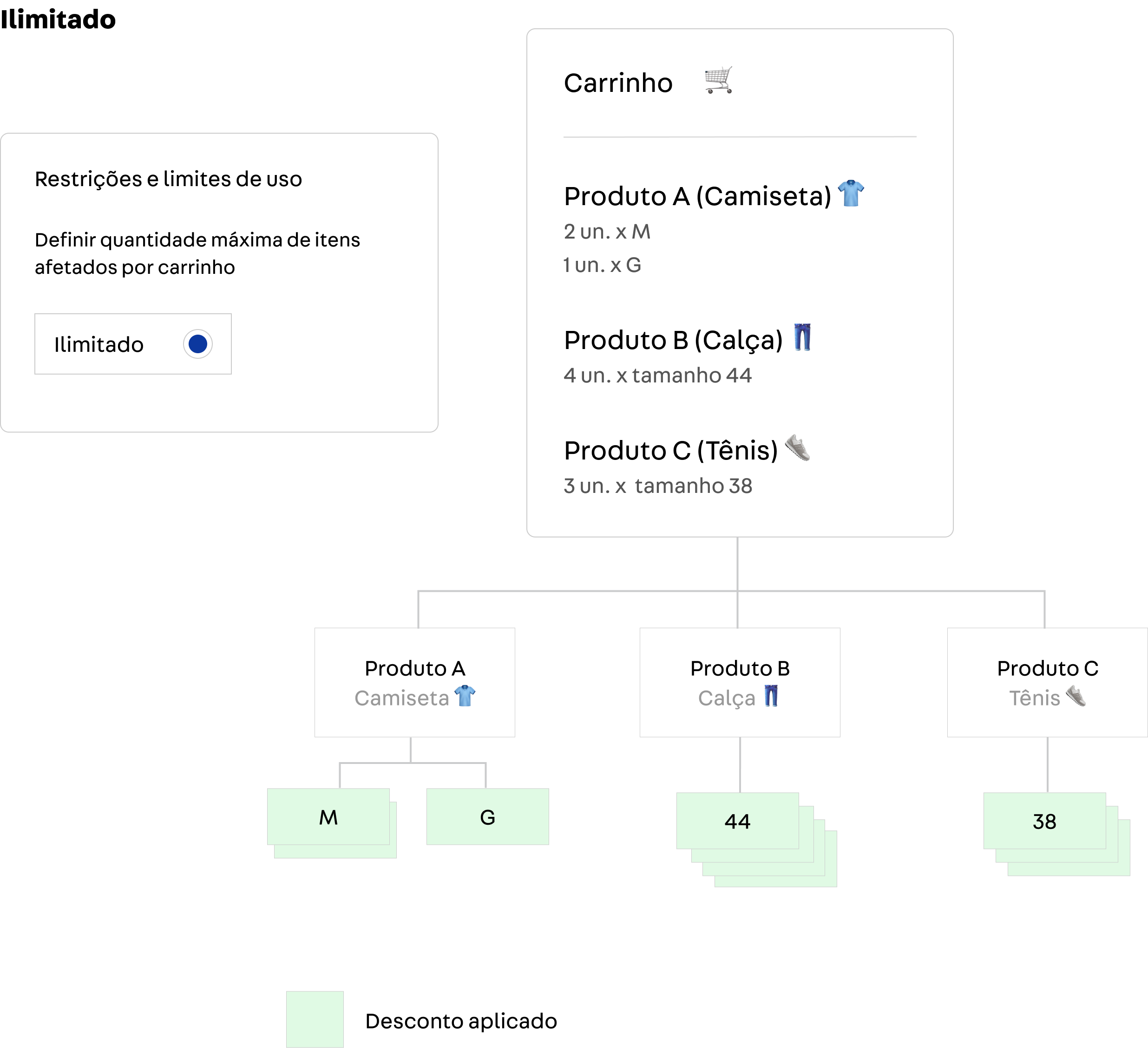 Por default, a seleção ilimitado está ativa, aplicando a promoção em todos os itens do carrinho, como ilustrado no diagrama abaixo: