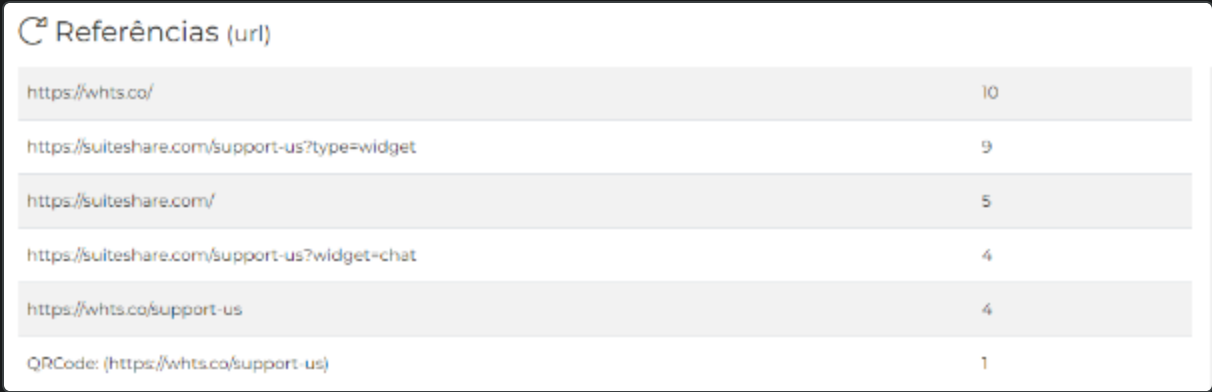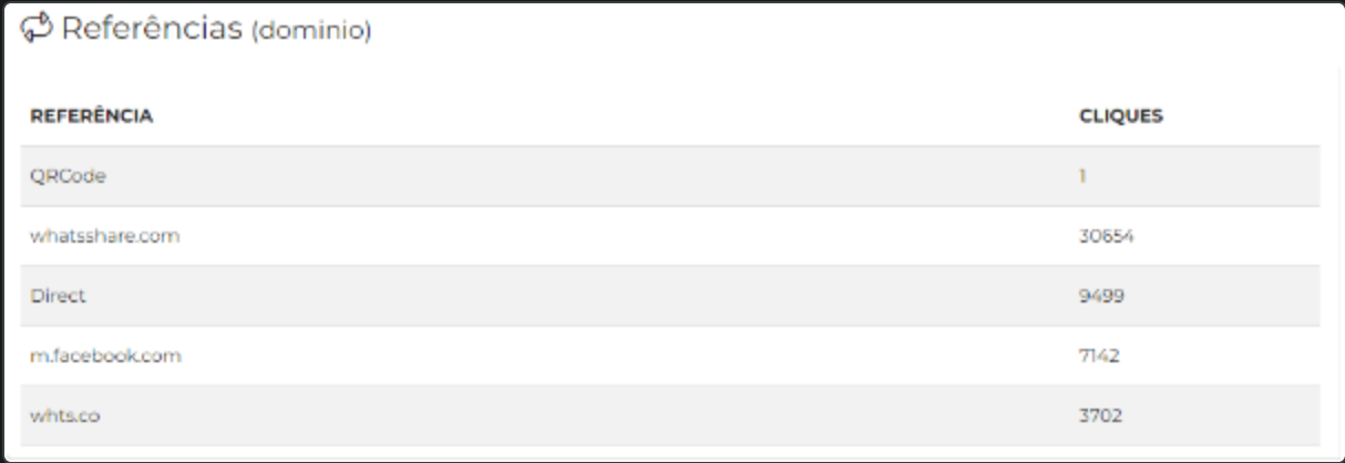Referência de onde veio os cliques - Sites (domínios) onde os seus clientes viram seus links e clicaram (aqui você descobrirá qual rede social ou canal de aquisição que você compartilhou os seus link ou utiliza seu chat e está tendo melhor conversão). Agora também é possível monitorar os acessos via QRcode.