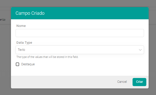 • O tipo de valor que o campo pode salvar, na seleção Tipo de Dados. Os tipos de valores aceitos são: Texto, Número, Data & Horário, Estado, Distrito e Divisão