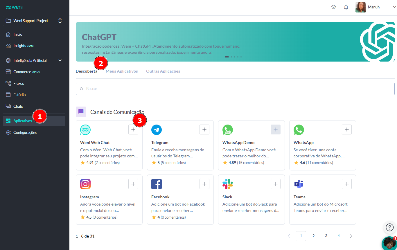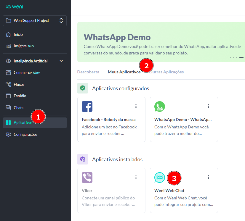 1. No seu projeto, clique em Aplicações > Descobrimentos > Adicione o canal Weni Web Chat.