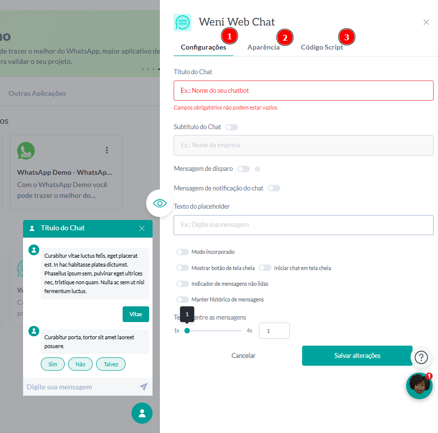 1. Ao clicar na aplicação, abrirá uma janela de configuração do seu Weni Web Chat com opções de personalização.