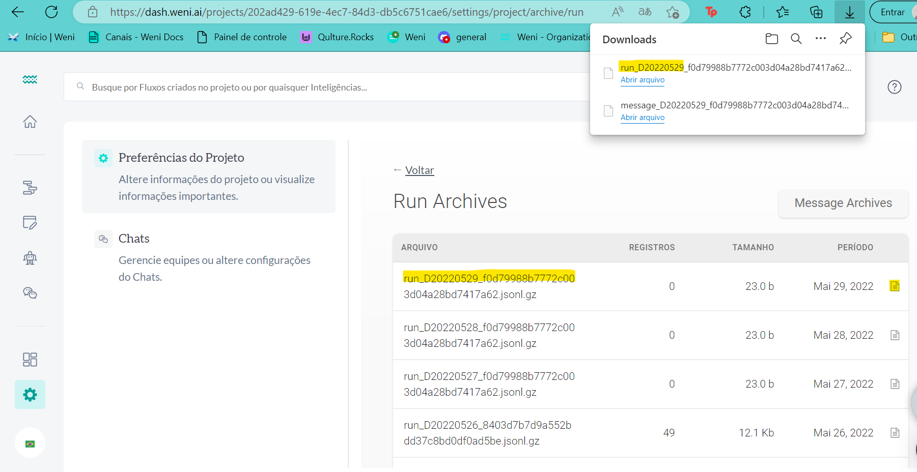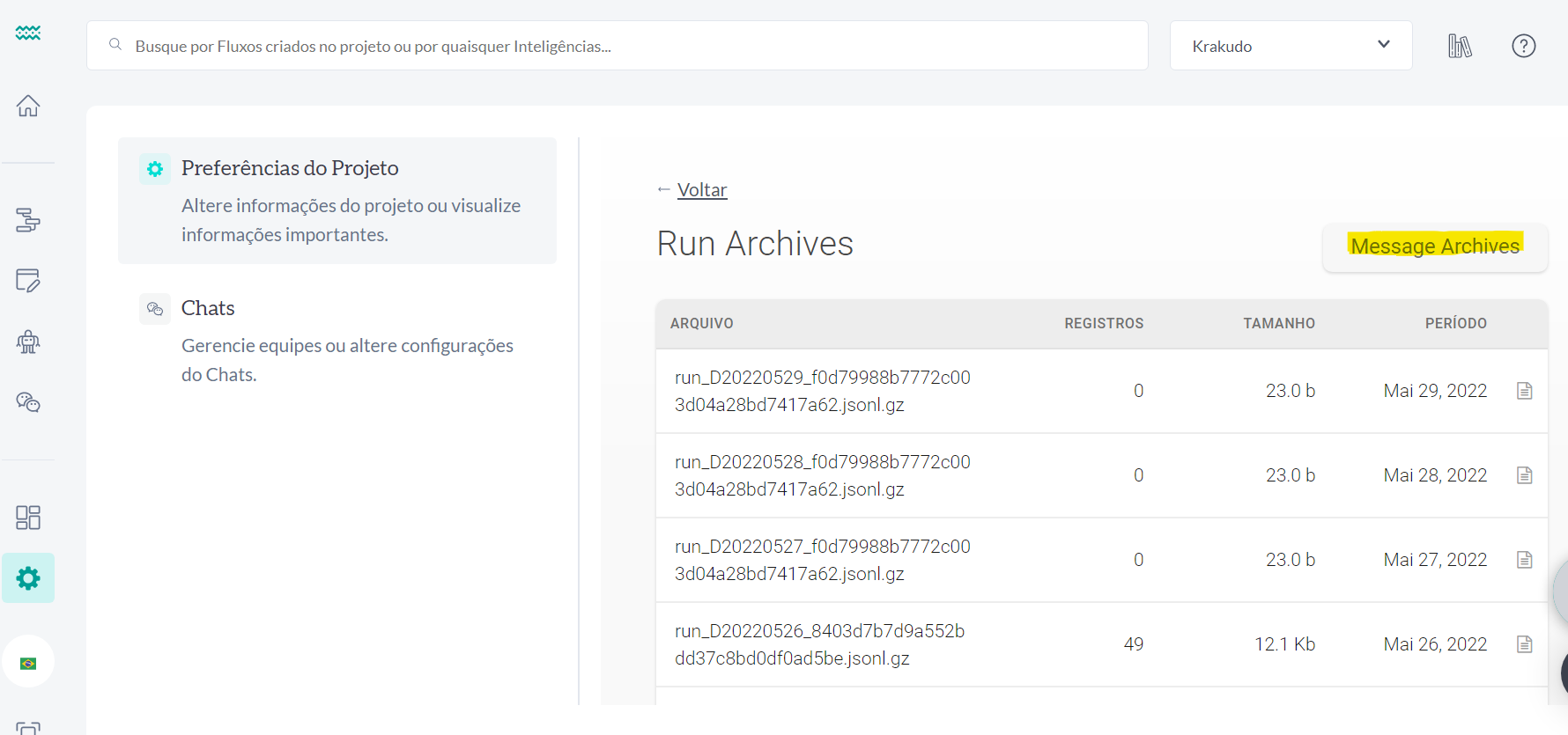 Algo muito importante para você saber sobre a coleta de dados na plataforma Weni é que os dados ficam armazenados por 180 dias. Logo, após este período os dados são arquivados na plataforma e armazenados em formato Json no menu Archives.