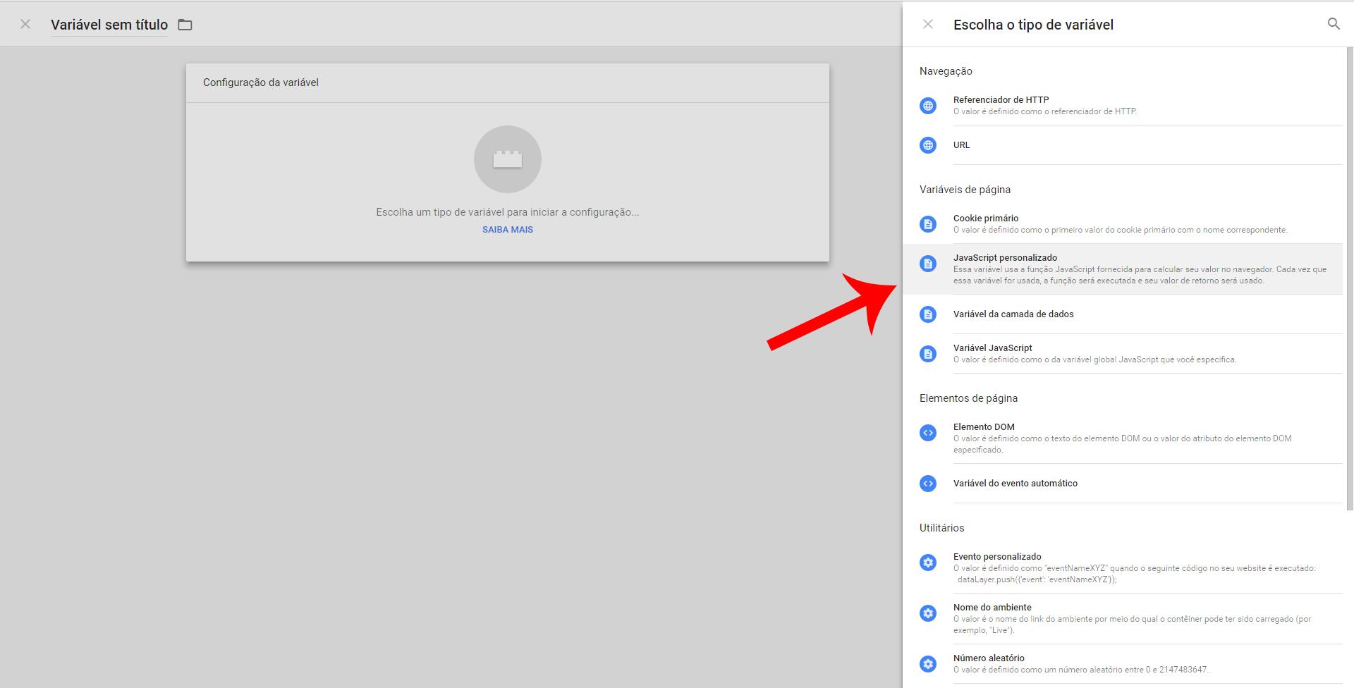 7. Clique em Configuração da variável e escolha o tipo JavaScript personalizado;