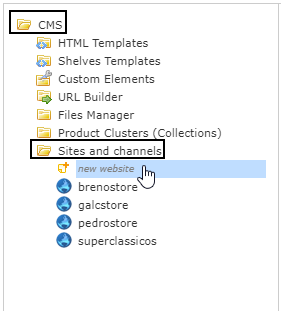 Storefront > Layout > Pasta CMS > Sites and Channels > New Website