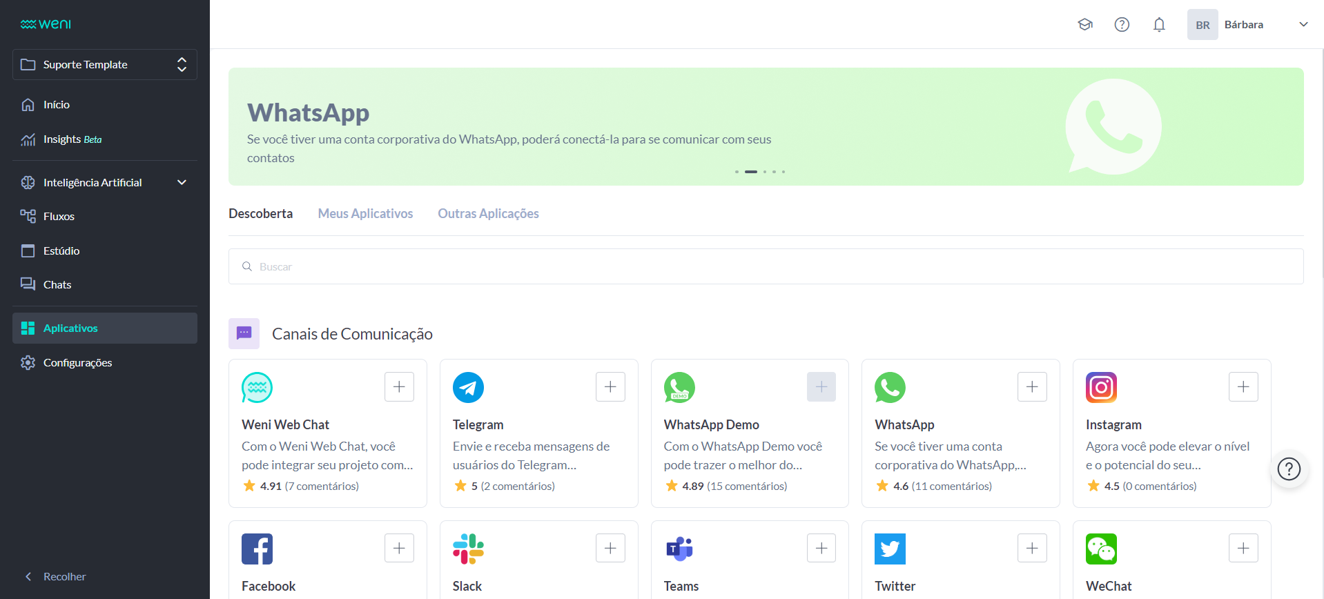 A Weni Plataforma permite que você teste o bot do WhatsApp de uma maneira rápida e prática através do nosso Módulo Aplicativos! Para utilizar essa ferramenta, basta seguir os passos:
