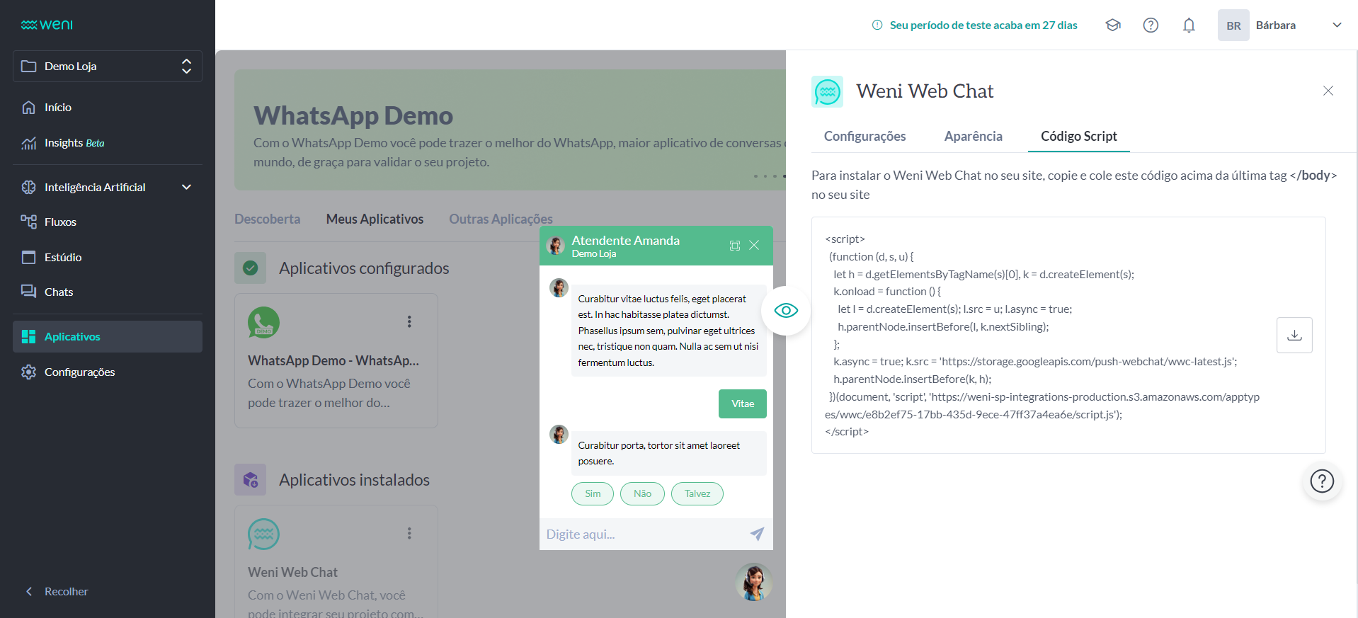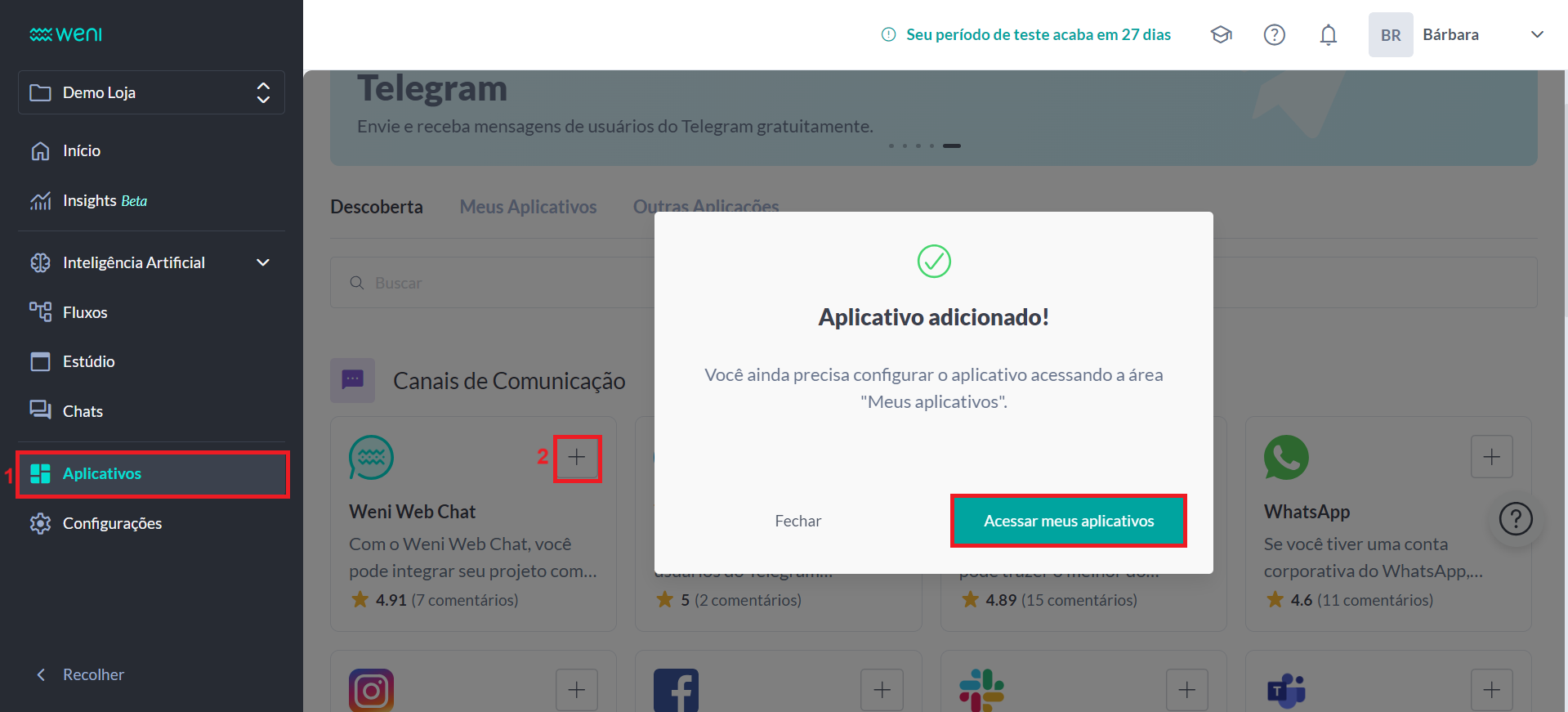 2. Ao clicar em Aplicativos > Descoberta, você seleciona a opção Weni Web Chat.