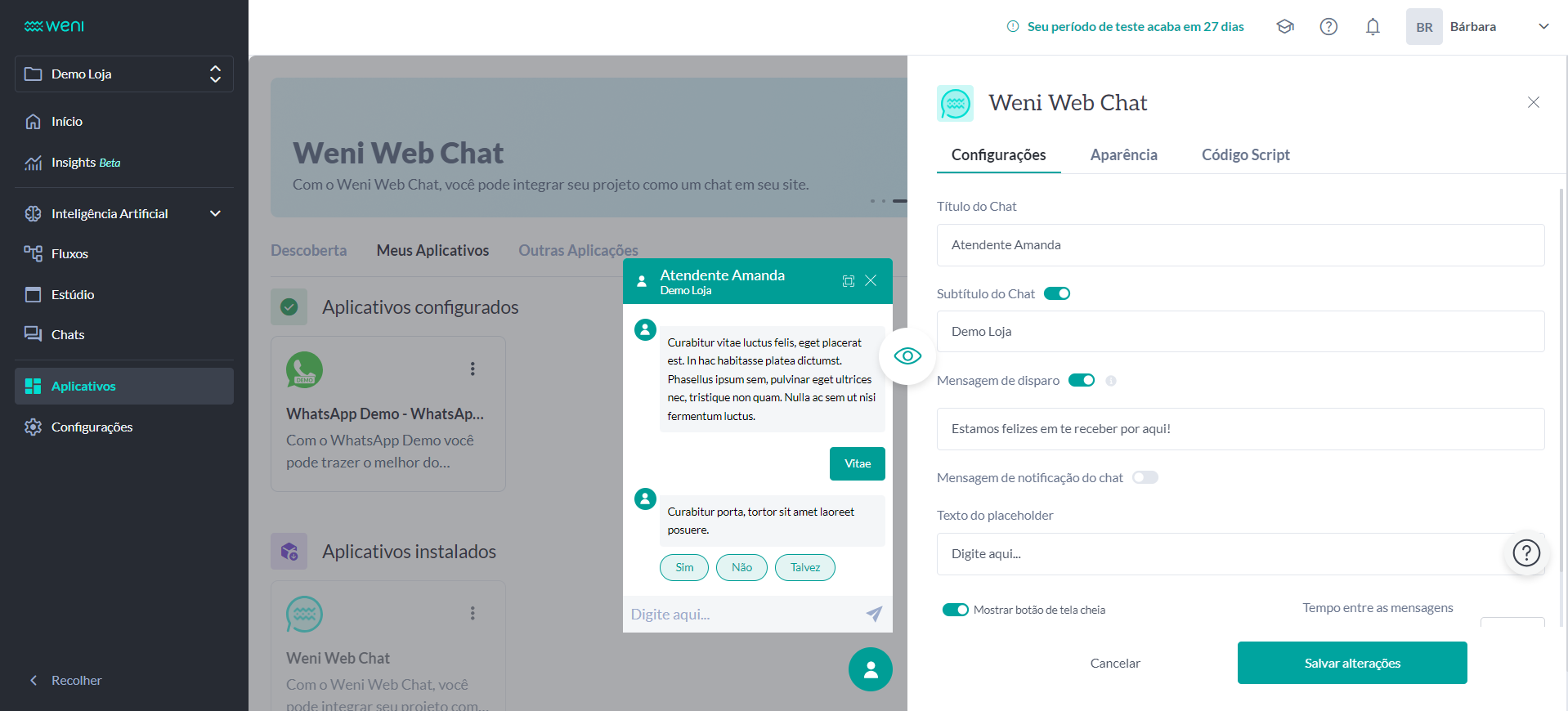 1. Ao abrir o painel de customização da Weni Web Chat, você terá as seguintes opções para configurar: