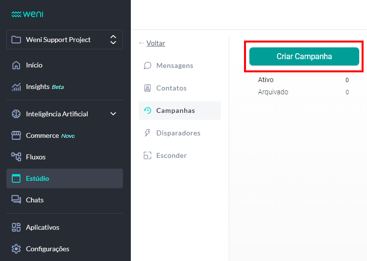 • Acesse a opção ""Campanhas"", dentro do módulo ""Estúdio"" no menu lateral