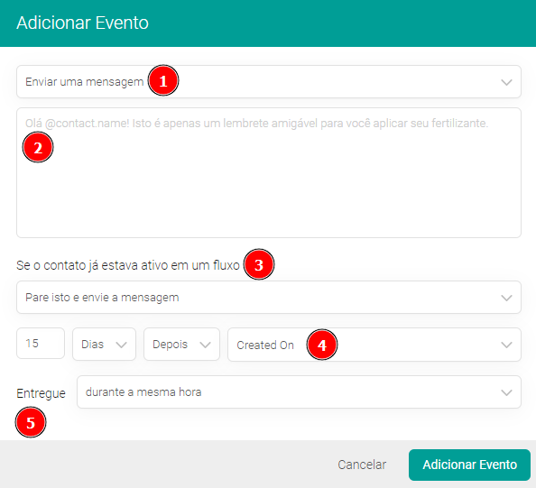 1. Em ""Entregue"": pode ser utilizado em caso de agendamentos para mais de 24h, aqui você pode definir se as pessoas receberam a mensagem na data e hora exata do evento, ou se você deseja padronizar para todas as mensagens serem disparadas juntas em um horário específico do dia.