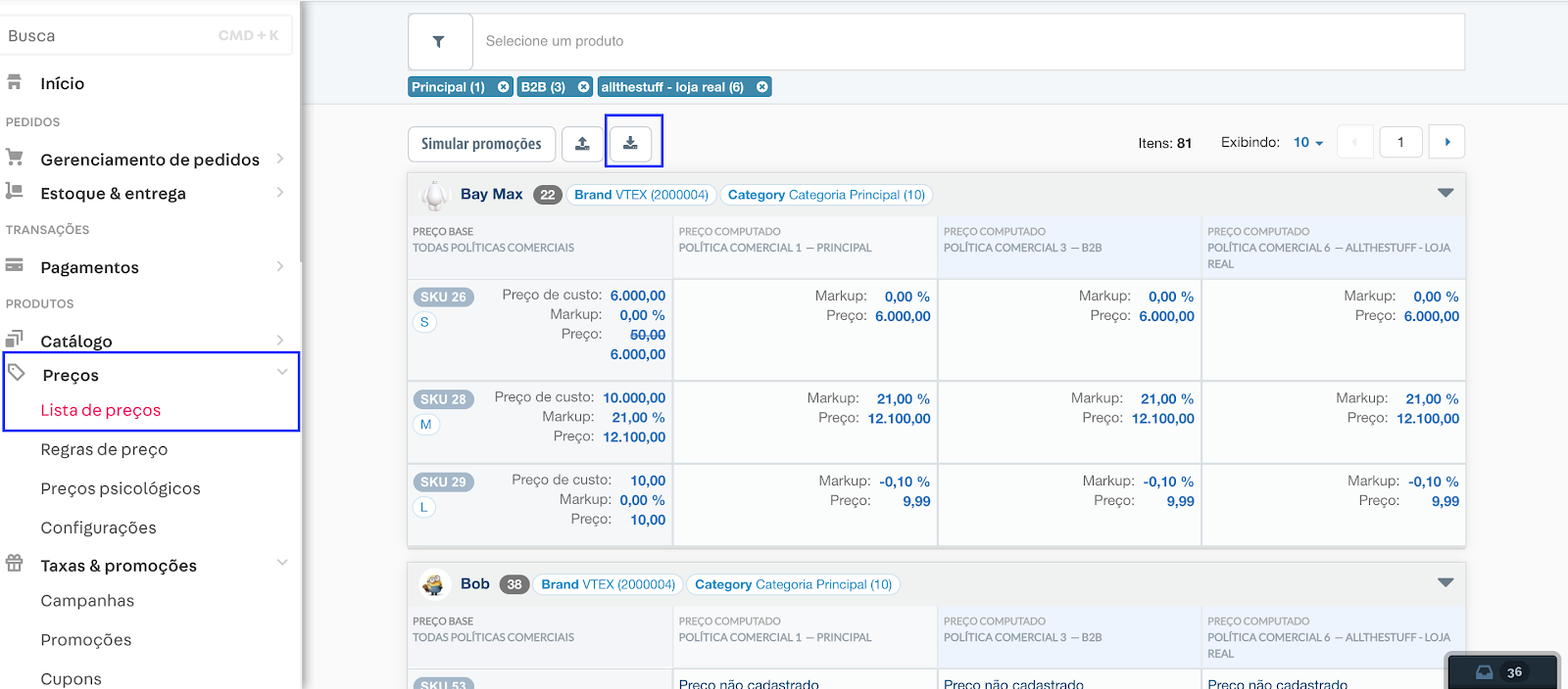 Para incluir metadados ao exportar uma planilha de preços de SKUs siga os passos abaixo: