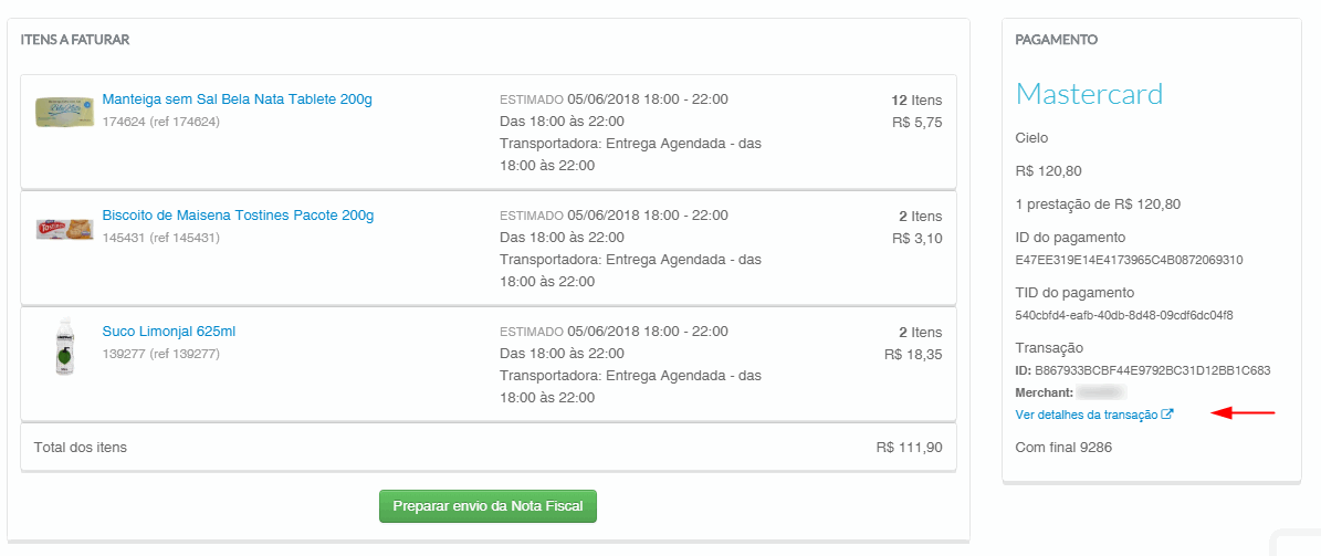 Ao abrir um pedido, clique em "Ver detalhes da transação" na caixa de pagamento:
