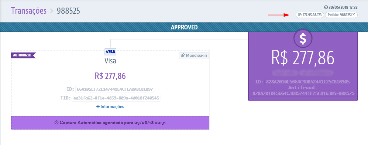 Para saber qual o IP de um cliente que realizou um pedido na sua loja, basta analisar a informação do pagamento para ter acesso a informação desse dado.