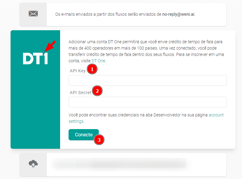 DT1 é uma plataforma que realiza transferências digitais B2B para recargas de celular e soluções de dados. Ao configurar esta opção, uma opção adicional aparecerá no fluxo.
