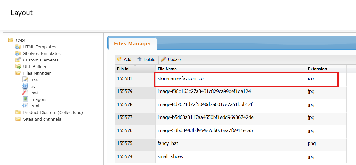 O nome do arquivo deve seguir o padrão {storeName}-favicon.ico. Substitua a variável {storeName} pelo nome da loja cadastrado no Gerenciamento da conta.