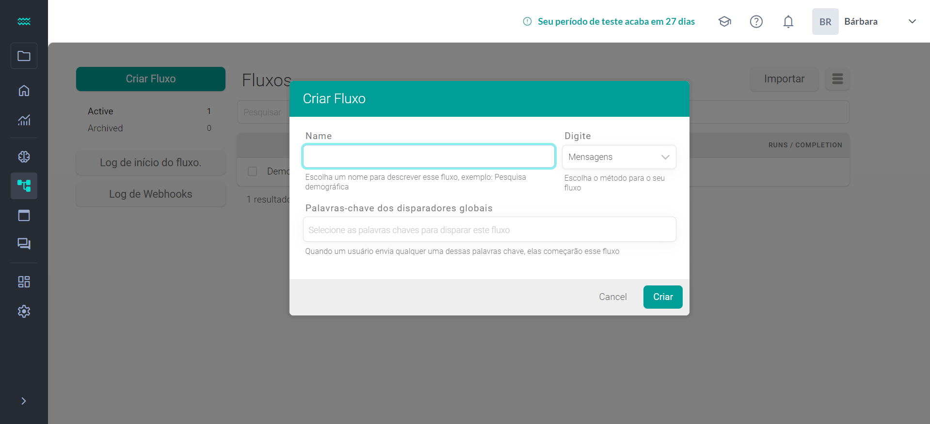 1. Depois disso, um pop-up para criação de fluxo irá aparecer na sua tela. Ele é formado por três campos que podem ser preenchidos: Nome , Palavras-chave dos disparadores globais , Digite