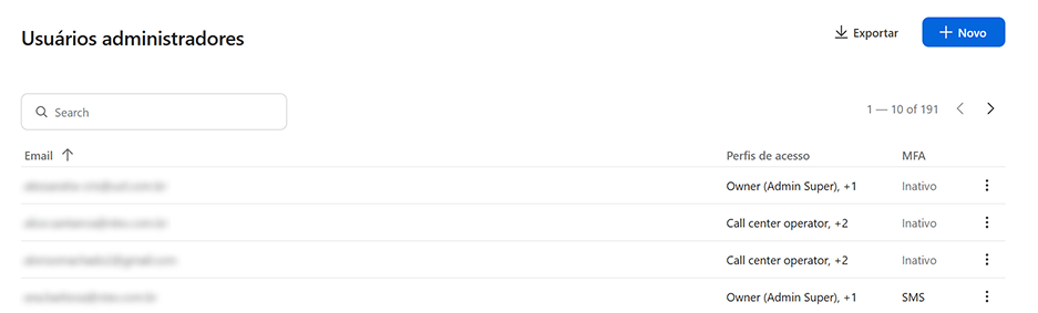 MFAConfiguração de autenticação multifator (MFA), que pode ter status Inativo ou exibir o método configurado (SMS ou Authenticator). Saiba mais em Habilitar login por autenticação de 2 fatores.