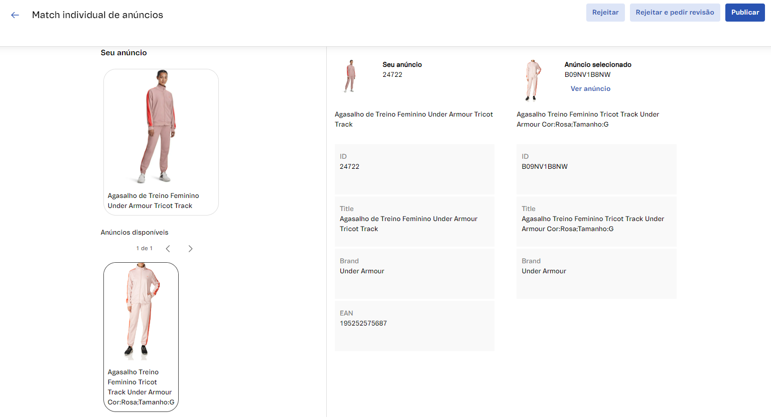 Rejeitar: esse botão irá excluir a sugestão de match e o seller deverá enviar novamente o seu produto caso queira, seguindo o tutorial de envio de produtos. - Botão