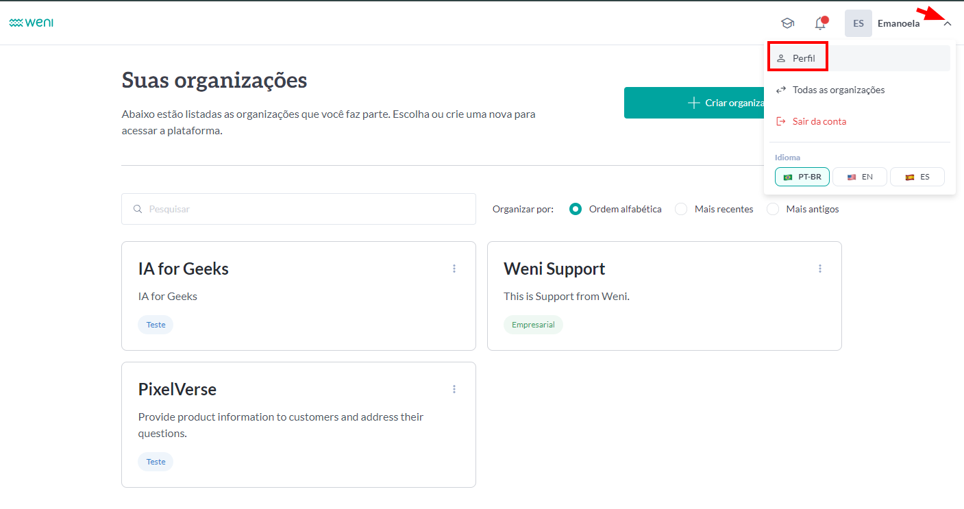 Sendo uma comunidade, a Weni é feita por seus usuários e colaboradores! Então, a seção Perfil permite que você gerencie sua conta e visualize todas as suas inteligências.
