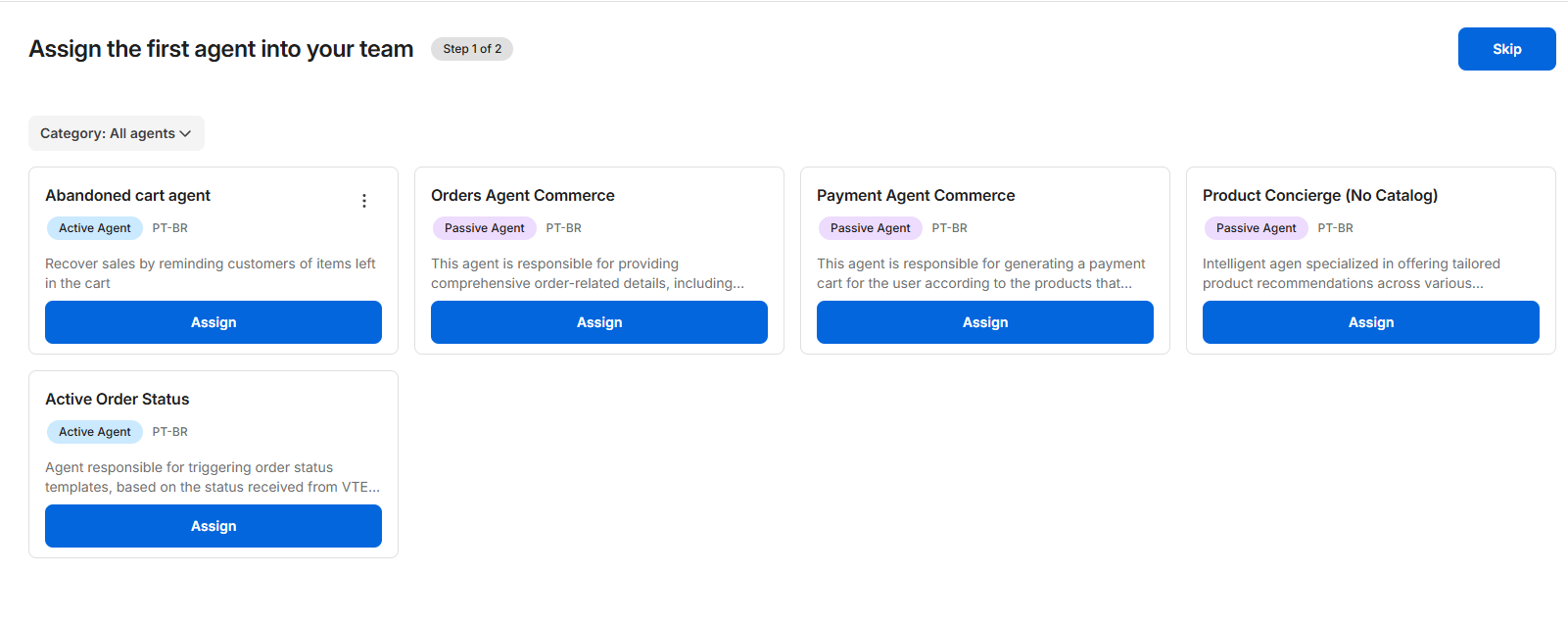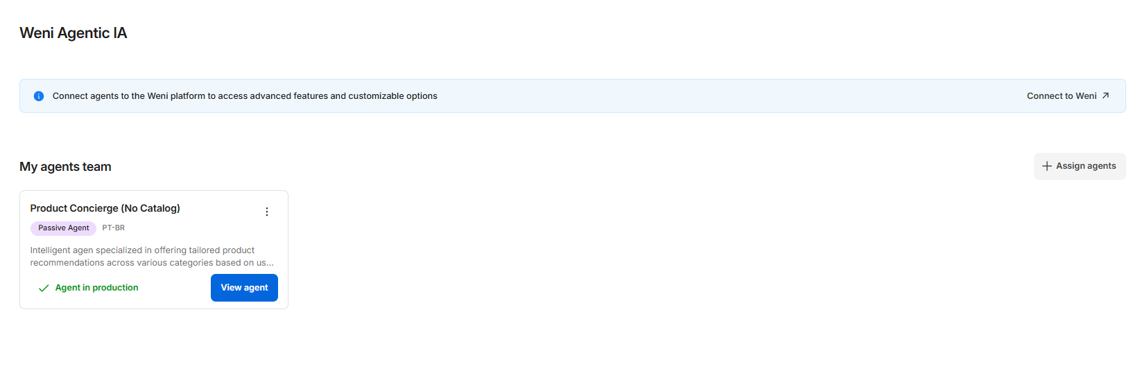 Caso deseje integrar mais agentes, você criar em atribuir agentes, ou poderá encontrar mais agentes na plataforma Weni.