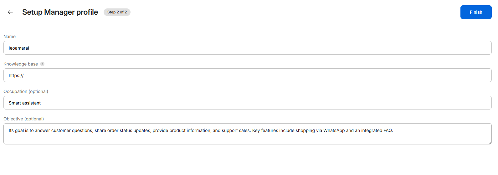 Ao selecionar os agentes e clicar em Pular ou Continuar, será possível visualizar a tela abaixo, que deverá ser a configuração do Manager da sua equipe de agentes. Caso tenha dúvidas de como preencher, acesse a seção Supervisor em Visão geral Weni by VTEX.