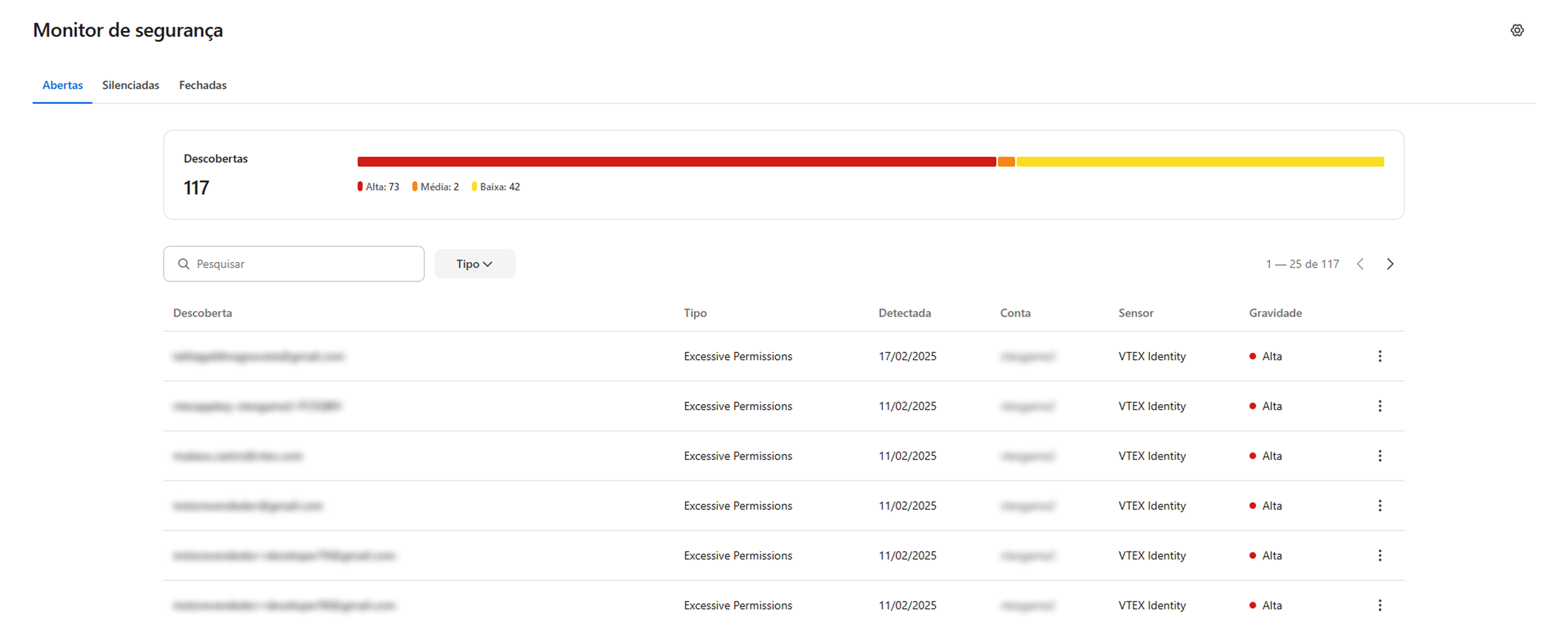 A aba Abertas apresenta as ameaças identificadas pelo Security Monitor que ainda não foram gerenciadas ou silenciadas.