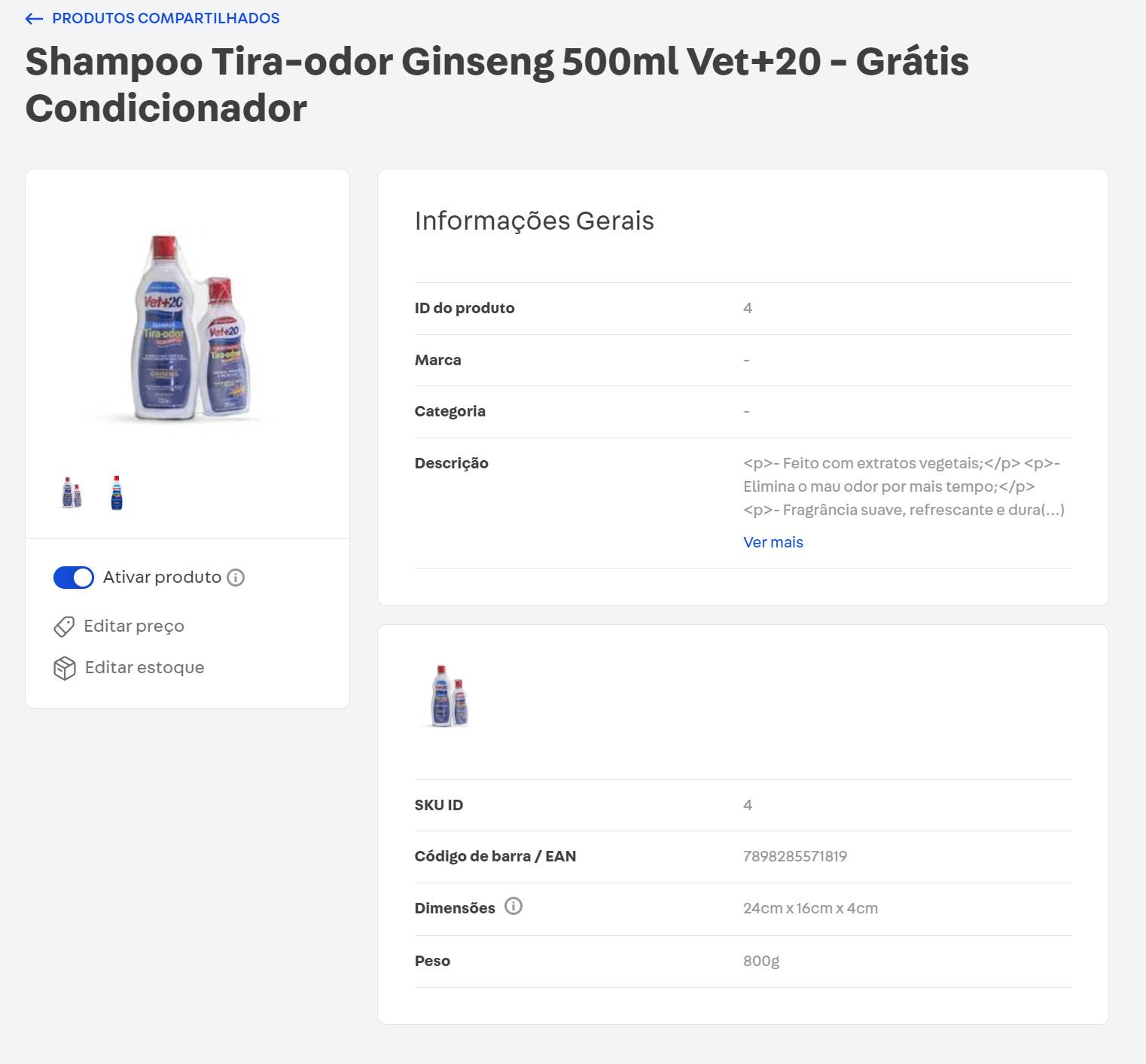 • Visualiza as Informações Gerais cadastradas pelo marketplace para aquele produto, como seu ID, foto, marca, categoria e descrição.
