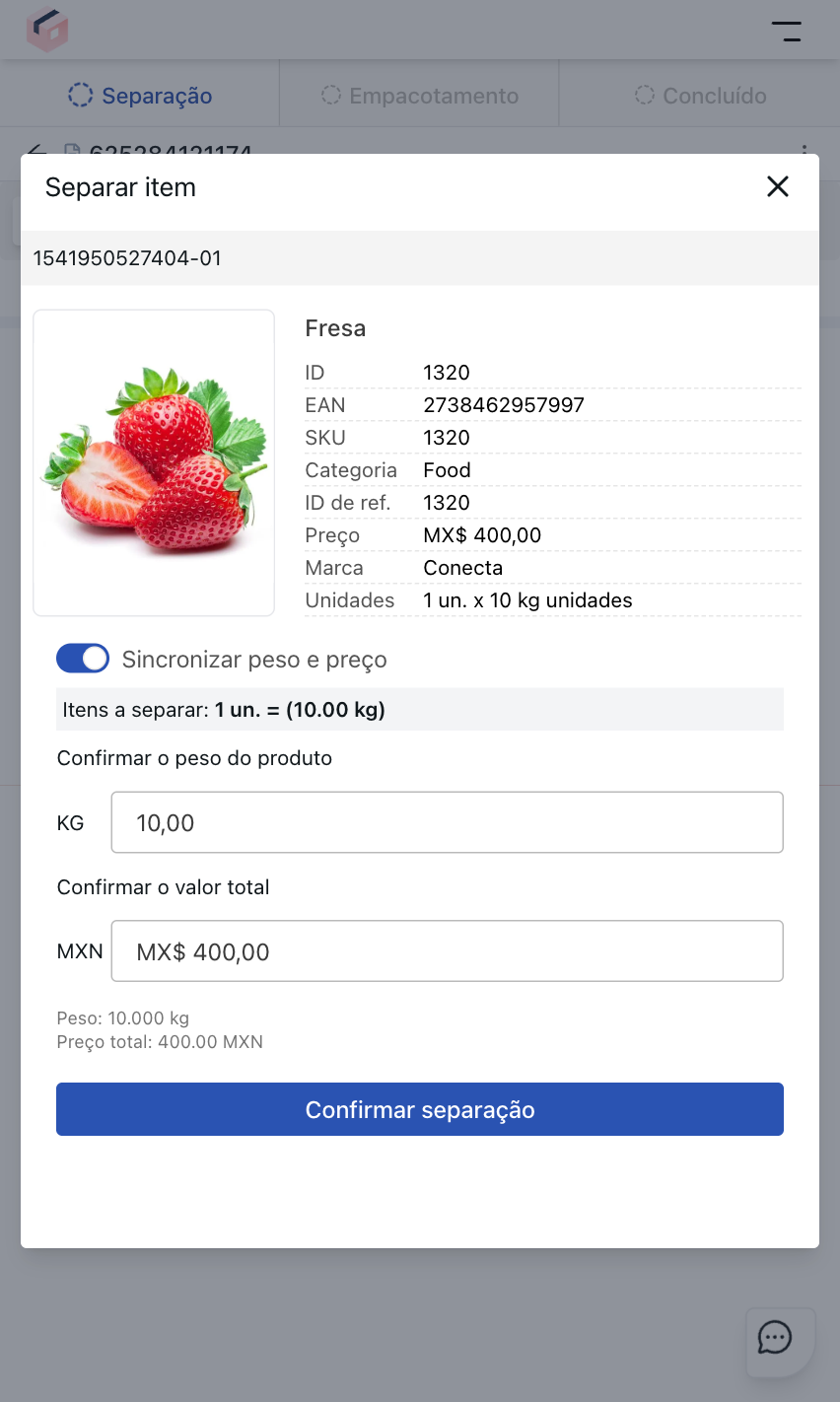 4. Clique em Confirmar separação ou Confirmar e separar todas as unidades, quando há várias unidades do mesmo item.