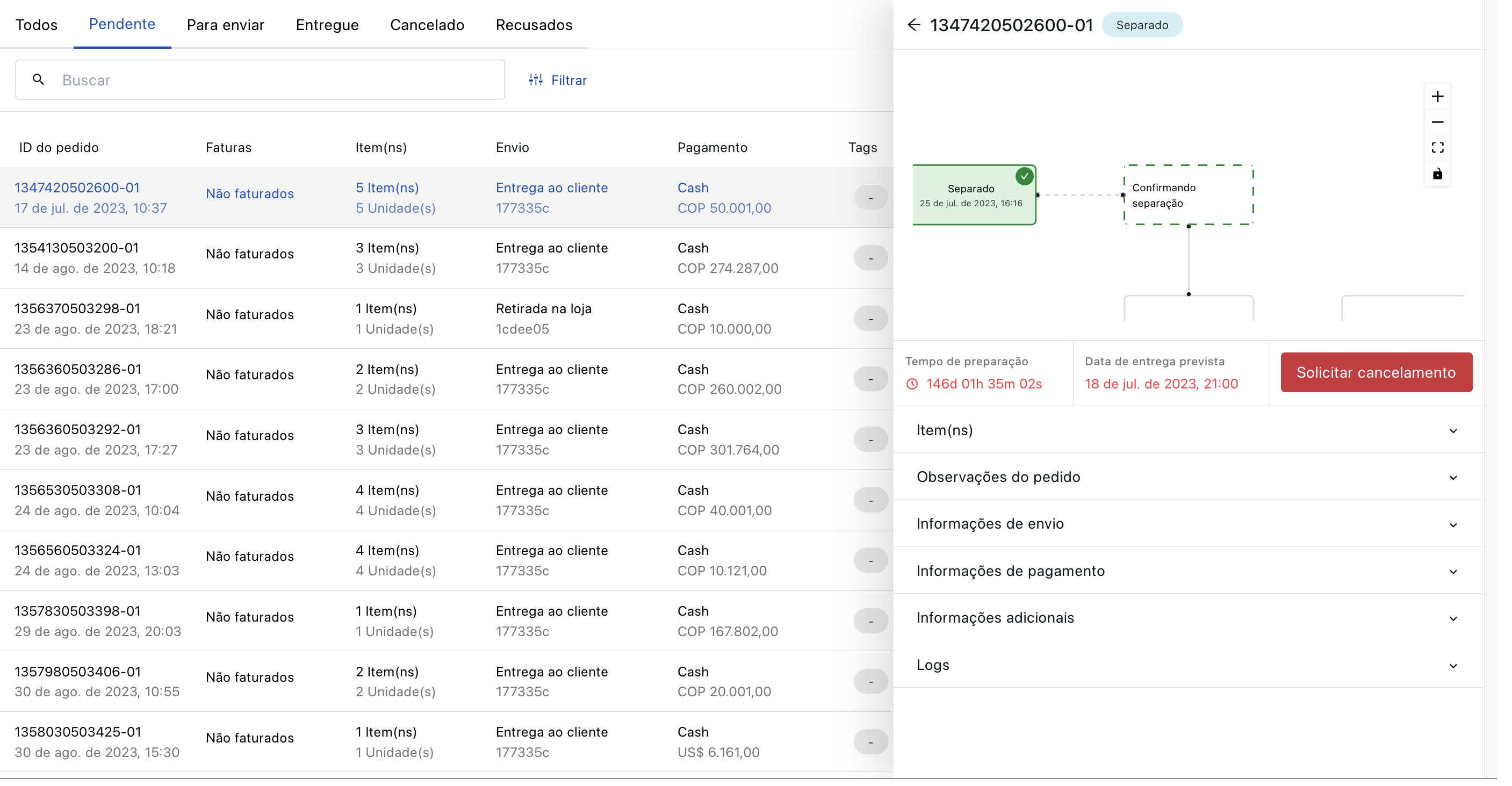- Pendente: pedidos pendentes, em separação de itens e em preparação.
