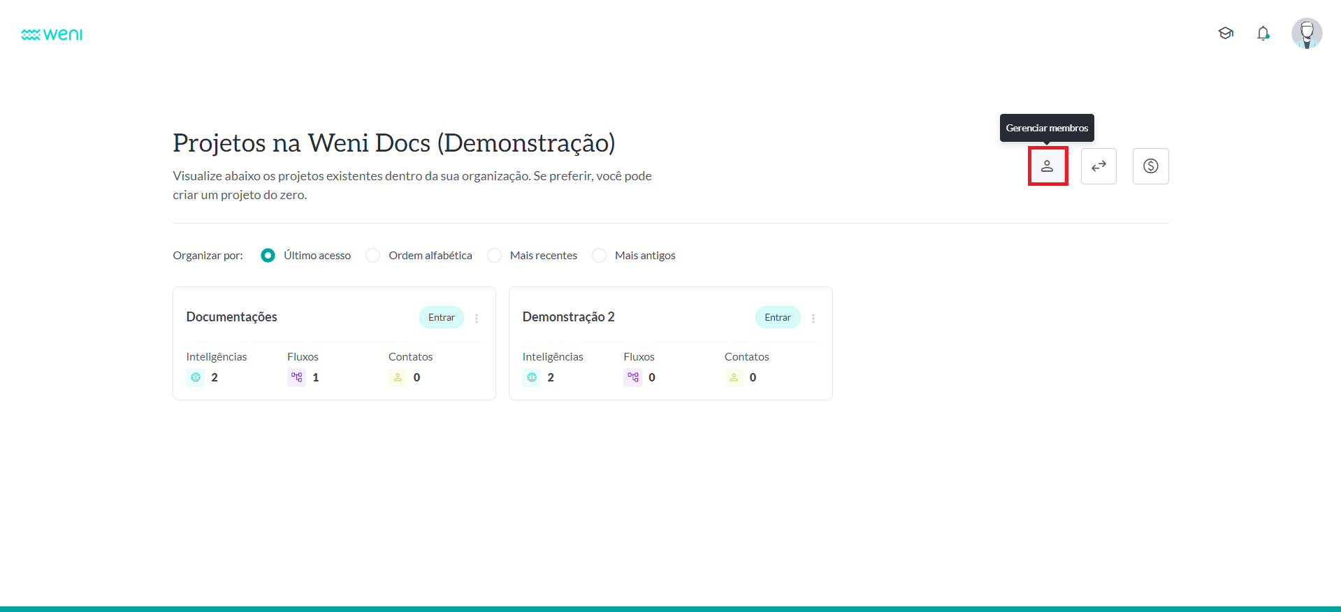 Para adição/exclusão de novos usuários como atendentes, primeiro adicione o usuário na Weni plataforma. Entre na sua organização da plataforma Weni e clique no ícone de “gerenciar membros” com os nomes e emails a serem adicionados/excluídos.