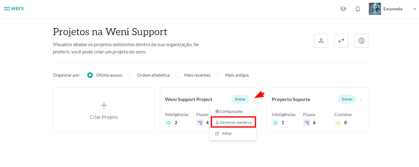 Em sua Organização, onde os projetos são listados, clique no local indicado no projeto específico: