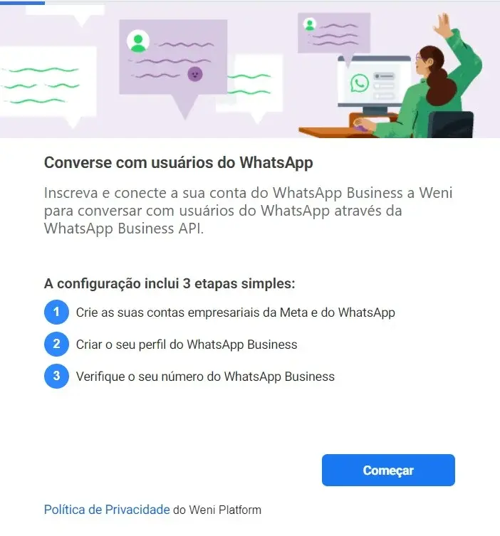 Aceite as permissões, elas são necessárias para que Weni Plataforma possa ter acesso a sua conta do WhatsApp Business e, assim, você consiga usar nossas integrações. Mas não se preocupe! Nenhum dado será compartilhado e todo esse processo é bastante seguro!