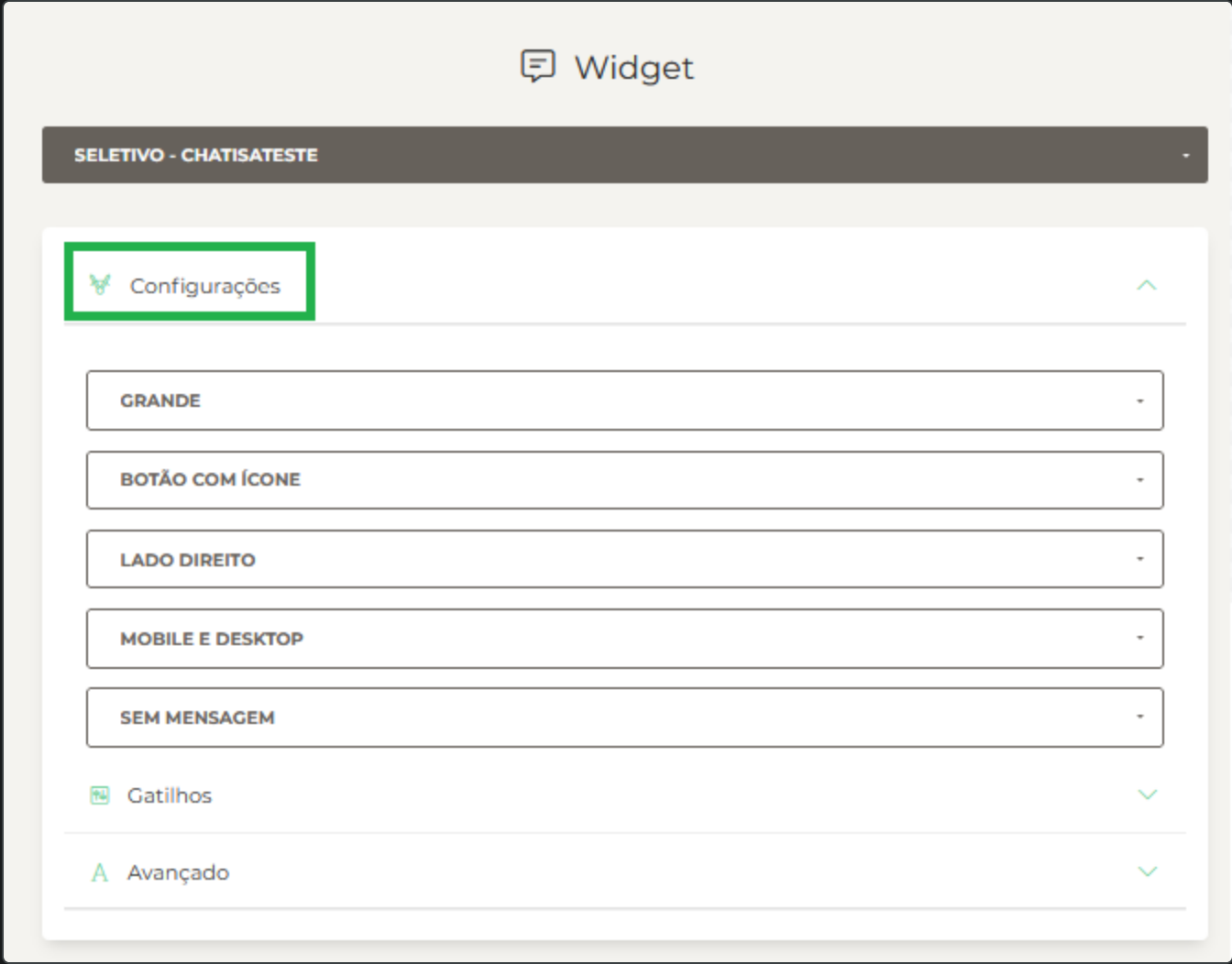 Entre as opções, é possível definir o tamanho do Widget, se ficará posicionado no canto inferior esquerdo ou direito e também, se terá ícone ou título, balão com mensagem ou não.