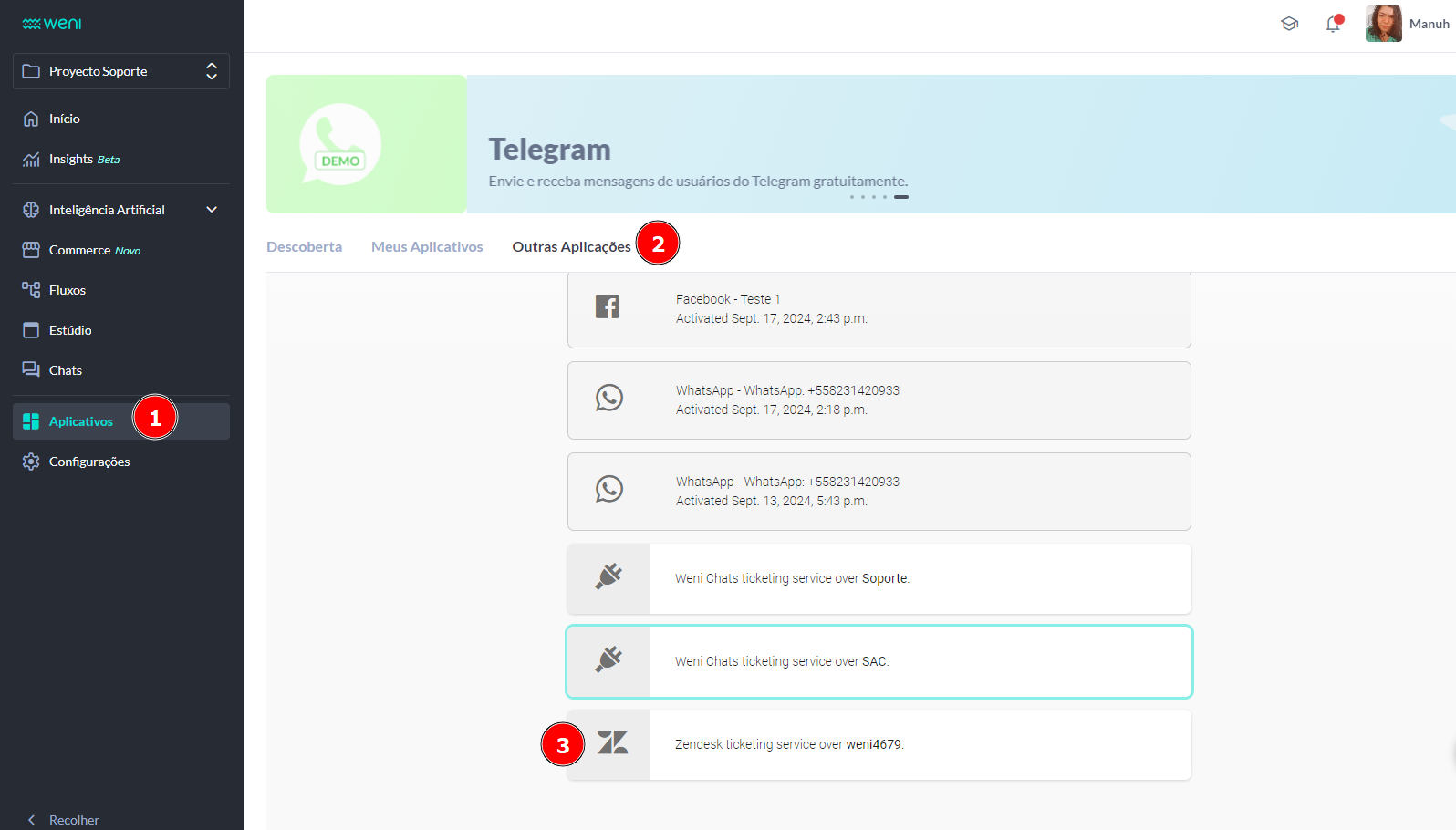1. Verifique a Conexão na Plataforma Weni Se todos os passos foram seguidos corretamente, em Aplicações > Outros Apps na Plataforma Weni, o serviço com o Zendesk deverá aparecer como conectado.
