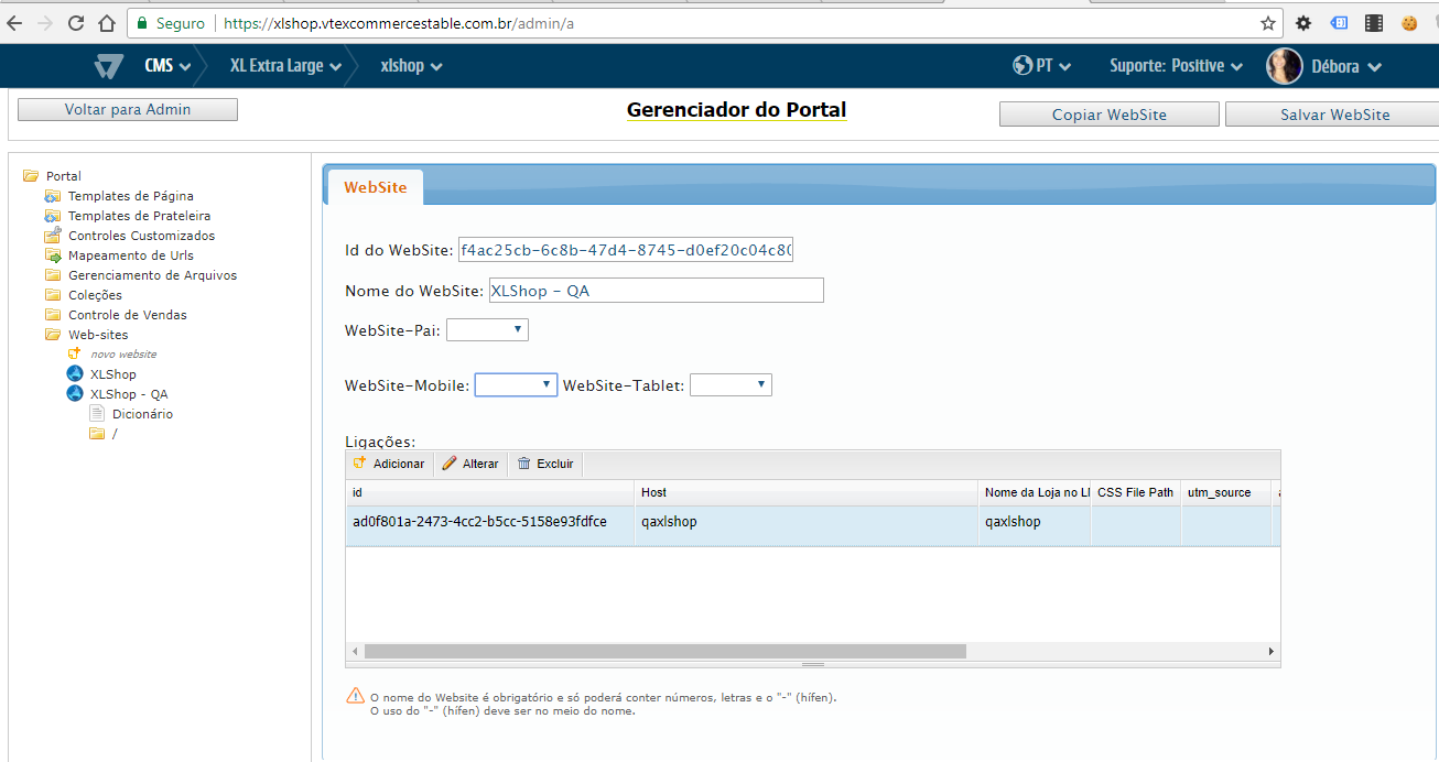 No módulo CMS, o sistema deixa o usuário manusear um Web Site A e apontar a um Web Site B como pai.