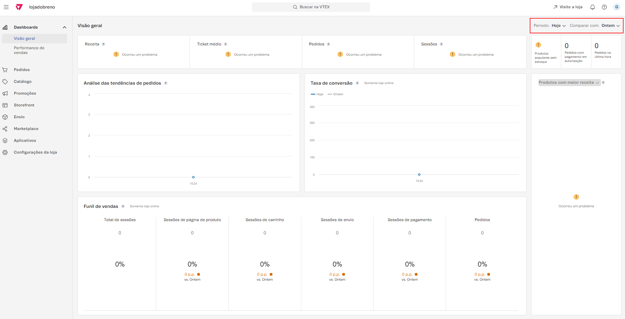 Ajustar o período de comparação pode resolver o problema ao exibir métricas que são relevantes. Para verificar se o período selecionado em Visão geral do dashboard contém dados de pedidos válidos, siga os passos abaixo:
