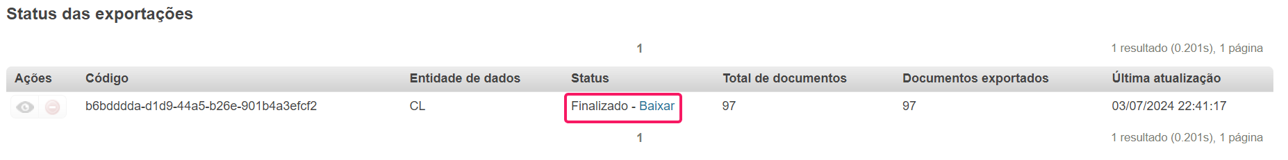 4. Em Status das exportações, identifique a linha do relatório que deseja acessar.