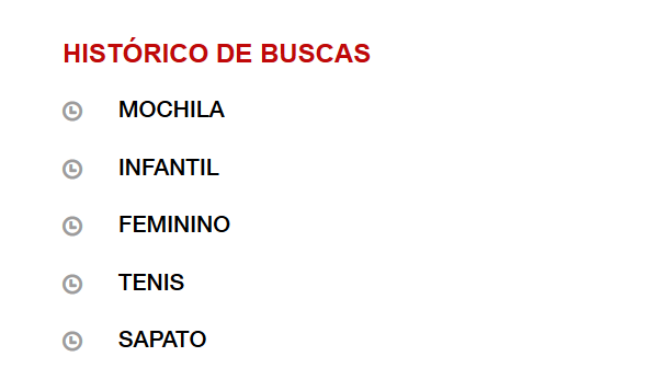 Essa seção exibe as últimas buscas efetuadas pelo cliente. Assim, é possível iniciar a interação com a busca instantaneamente.