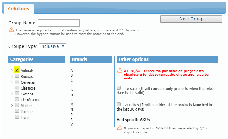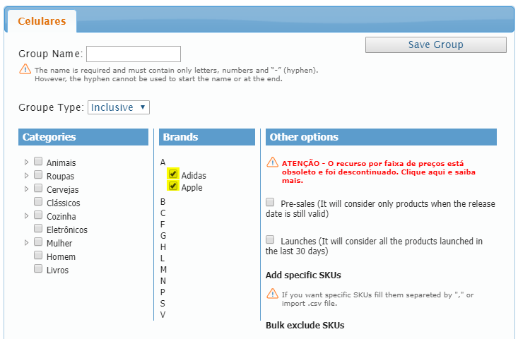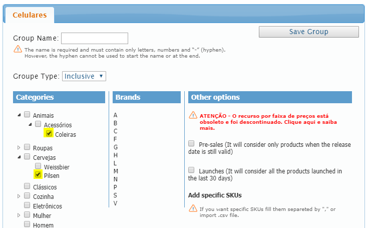 Para criar um grupo com produtos de uma ou mais marcas, basta selecionar a marca desejada na lista correspondente.