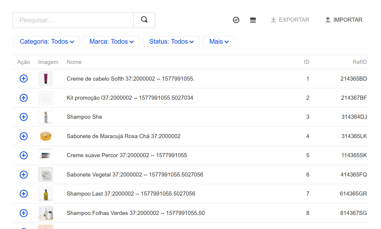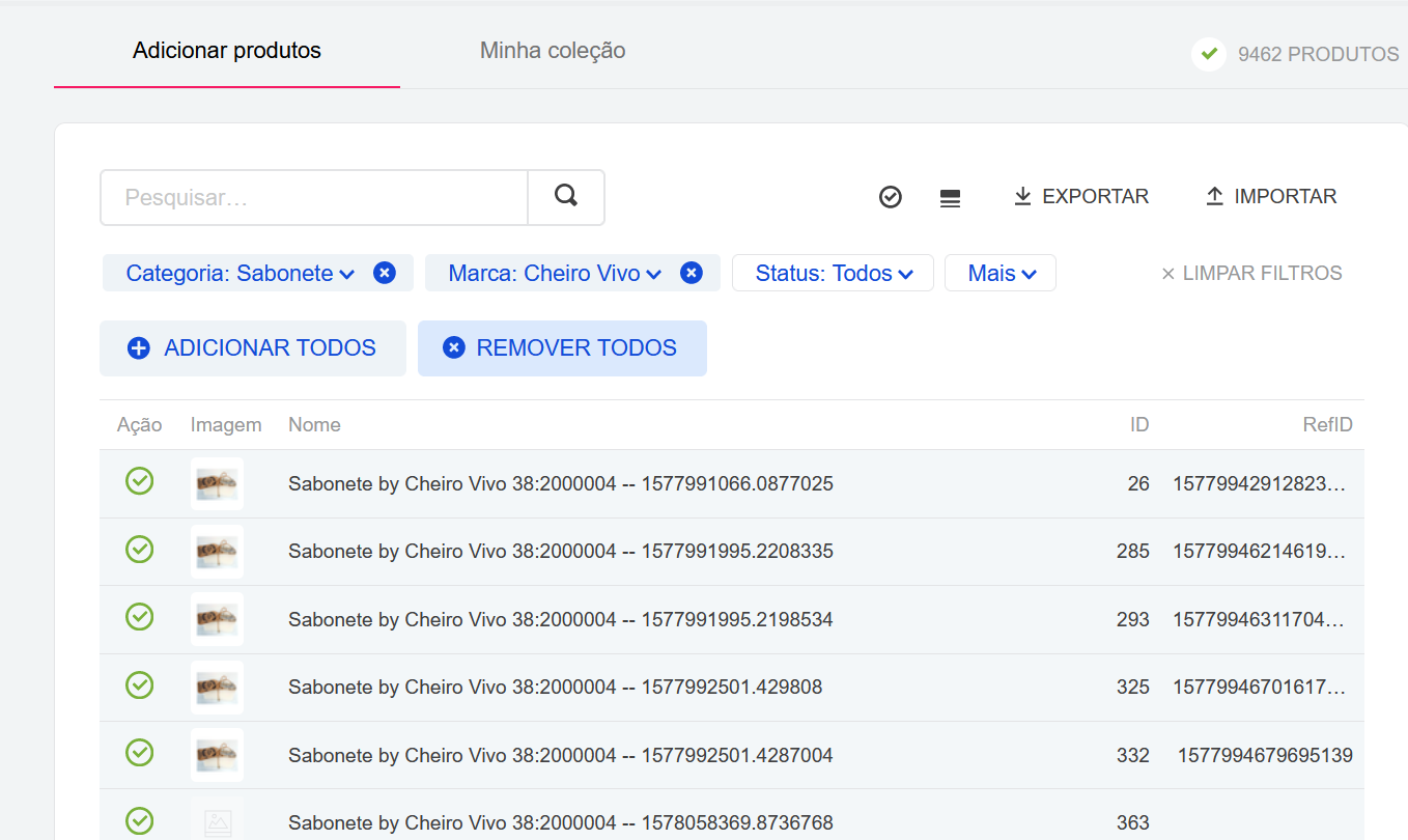 Os produtos podem ser adicionados tanto pela seleção de itens na lista do módulo de Coleções quanto por importação de uma planilha em formato CSV ou XML.