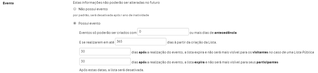 Ao selecionar POSSUI EVENTO, o formulário disponibiliza outras opções de configuração para o evento, onde será possível configurar todas as datas limites para criação desse tipo de lista, conforme imagem abaixo.