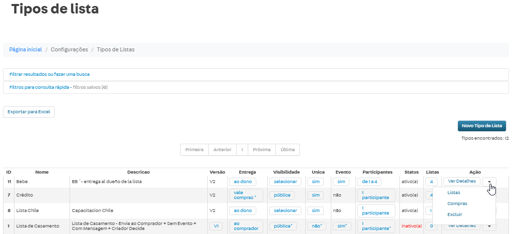 - Exportar para Excel: Permite exportar os dados de tipos de listas para Excel.
