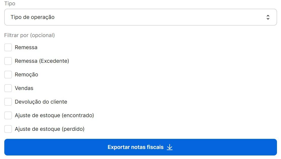 Tipo: é um filtro opcional e o seller pode selecionar somente um dentre Tipo de operação e Tipo de nota fiscal. Para buscar notas fiscais de todos os tipos, selecione a opção Todos.